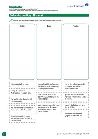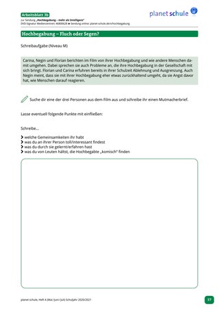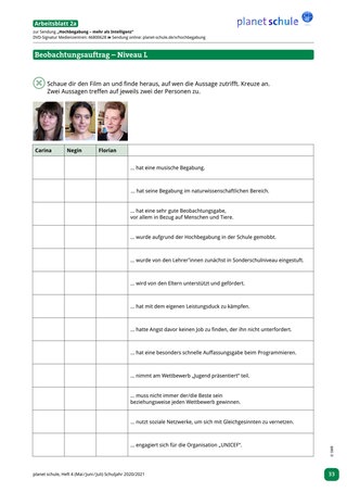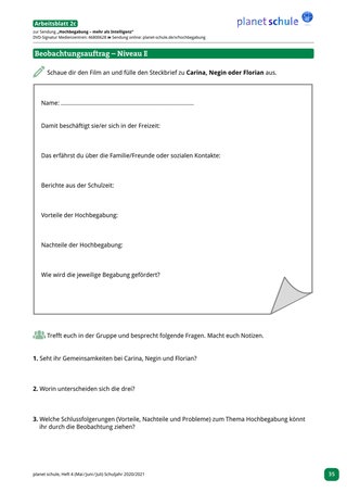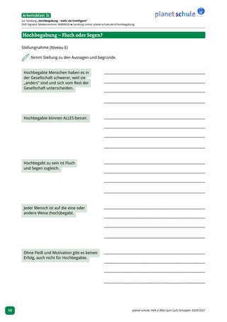 Mit dem Arbeitsblatt 3 wird in unterschiedlichen Niveaustufen der Frage nachgegangen, ob Hochbegabung eher Fluch oder Segen ist. In Arbeitsblatt 3a (leichtes Niveau) ordnen die Schüler*innen Aussagen aus dem Film entsprechend zu. Arbeitsblatt 3b (mittleres Niveau) legt den Schwerpunkt darauf, sich in die Protagonist*innen einzufühlen und eventuell einen Perspektivwechsel anzubahnen. Bei Arbeitsblatt 3c (erweitertes Niveau) sollen die Schüler*innen Stellung zu verschiedenen Aussagen zum Thema Hochbegabung nehmen. Sie werden aufgefordert, ihre jeweilige Position umfassend zu begründen.