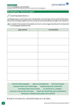 | Sicherung | Zuordnungsaufgabe „Hochbegabung Fluch oder Segen“ Alternativ: Schreibaufgabe Alternativ: Stellungnahme | Partnerarbeit