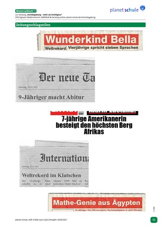 Mithilfe des Materialblattes 1 kann die Lehrkraft nun etwas konkreter zum Thema Hochbegabung überleiten. Ein kurzes Gespräch über die auf dem Blatt erwähnten Schlagzeilen gibt den Schüler*innen einen ersten Hinweis darauf, dass es viele außergewöhnliche und vor allem auch unterschiedliche Begabungen bereits im Kindesalter gibt.