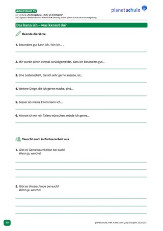 Zur Einstimmung in die Thematik beginnt der Unterricht mit einem interaktiven Arbeitsauftrag, bei dem sich die Schüler*innen im Klassenraum bewegen und sich gegenseitig befragen. Sie sollen herausfinden, welche Fähig- und Fertigkeiten die anderen haben und diese in Arbeitsblatt 1a eintragen. In höheren Klassen kann alternativ Arbeitsblatt 1b verwendet werden. Hier reflektieren die Schüler*innen zunächst in Einzelarbeit eigene Talente, Fertigkeiten und Interessen und tauschen sich anschließend in Partnerarbeit aus.