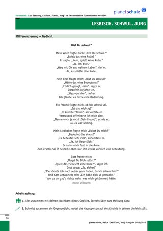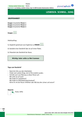 Der Praxisbericht bezieht sich auf den Unterrichtsentwurf, den Sie online bei Planet Schule finden: Lesbisch. Schwul. Jung: Methodisch-didaktische Hinweise, Unterrichtsverlauf, Arbeitsblätter