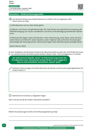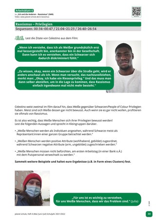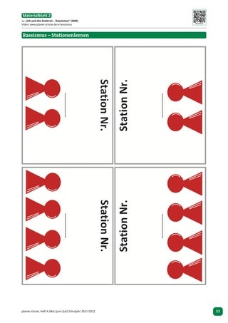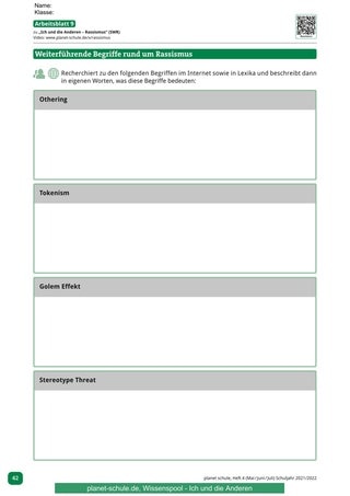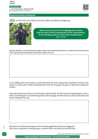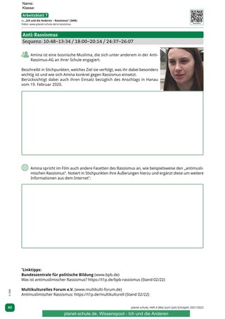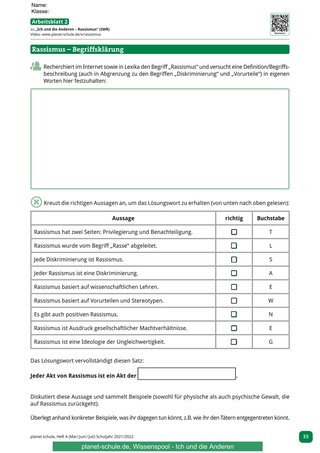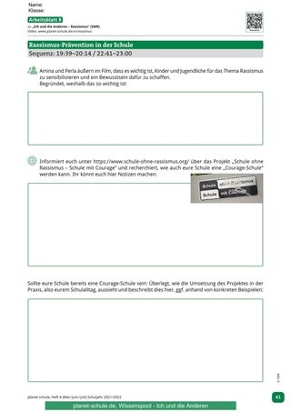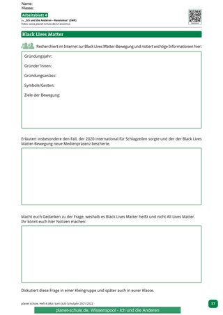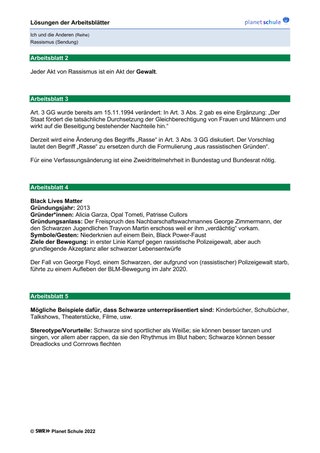 Die Arbeitsblätter 2 bis 9 an den Stationen vertiefen die Inhalte des Films und regen zur aktiven Auseinandersetzung mit dem Thema Rassismus an, indem u.a. Diskussionsgrundlagen zu ganz konkreten Unterthemen geschaffen werden, aber auch (eigene) Lösungsansätze gesucht werden können.