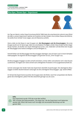 Sollte die konkrete Durchführung des Experiments für die Lerngruppe nicht geeignet sein, besteht die Möglichkeit, dass die Klasse das „Blue Eyes/Brown Eyes-Experiment“ von Jane Elliott mithilfe des Materialblattes 1 lediglich theoretisch bespricht und sich darüber im Plenum austauscht. So wird eine gewisse Distanz gewahrt, wobei dennoch eine Triggerwarnung ausgesprochen werden sollte und die Lehrkraft äußerst sensibel die Reaktionen der Schüler*innen beobachten sollte, um gegebenenfalls intervenieren zu können.