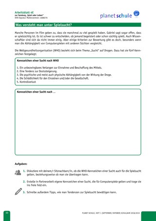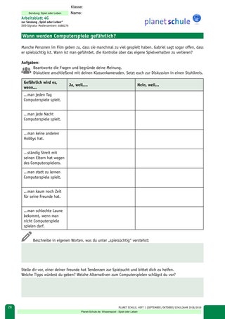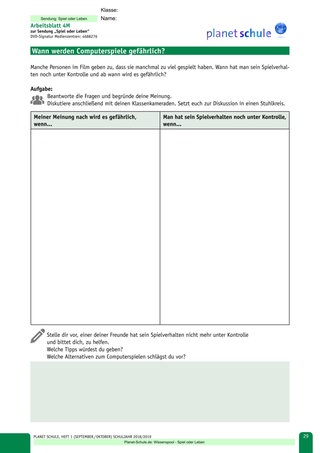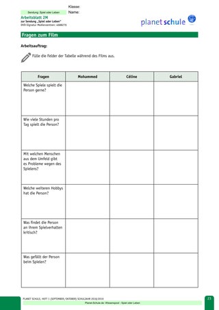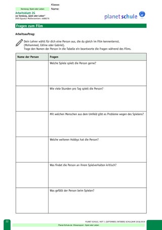 | Erarbeitung | - Film: Spiel oder Leben - Begleitendes Arbeitsblatt | Einzelarbeit | Arbeitsblatt 2 |