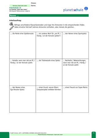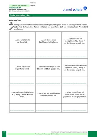 Zur Einstimmung in die Thematik beginnt der Unterricht mit einem interaktiven Spiel (Arbeitsblatt 1), wobei die Lernenden gegenseitig Wissen, Nutzung und Erfahrung im Bereich Computerspiele abfragen. Zur Würdigung der Schülerarbeit sollen im Anschluss nicht einzelne Ergebnisse veröffentlicht, sondern vielmehr ein Überblick über die Medienaffinität der Klasse gewonnen werden.