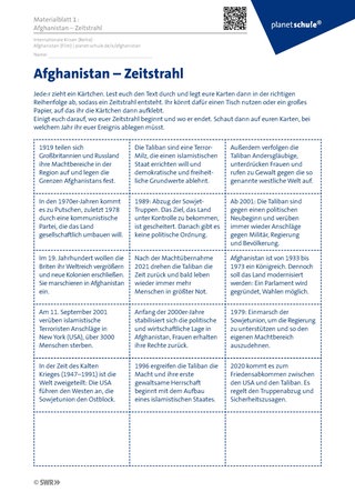 Die Lehrkraft erläutert den Zeitstrahl, den die Klasse legen soll: Die Schüler:innen erhalten Infokärtchen zur Geschichte Afghanistans (Materialblatt 1), sortieren sie chronologisch und legen sie auf einem Tisch oder einem vorbereiteten großen Papier aus.