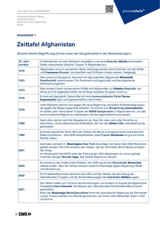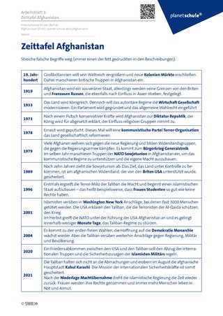 - Die Schüler:innen erhalten dazu Arbeitsblatt 1 (Zeittafel Afghanistan), welches sie während des Anschauens durch einfaches Wegstreichen falscher Begriffe gut bearbeiten können; vorher Lesezeit einplanen.