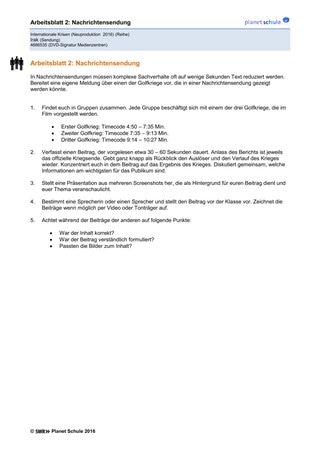Darauf folgt die Analyse der drei Golfkriege, die eine entscheidende Rolle für die Entwicklung der Irak-Krise spielen. Die Schülerinnen und Schüler werden in sechs Gruppen aufgeteilt, um eigene kurze Meldungen vorzubereiten, die in einer Nachrichtensendung gezeigt werden könnten. Jeweils zwei Gruppen widmen sich einem Ereignis der Irak-Krise (Erster, Zweiter und Dritter Golfkrieg). In den Gruppen wird eine kurze Präsentation mit Screenshots erstellt. Sie verfassen einen Text, der 30 – 60 Sekunden lang ist. Sie schildern die Hintergründe des Ereignisses. Eine Person stellt den jeweiligen Beitrag vor. Idealerweise werden diese Beiträge aufgezeichnet.