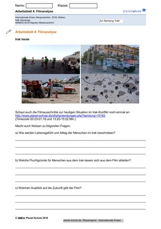 Die Schülerinnen und Schüler aktivieren ihr Vorwissen durch den Lehrerimpuls: „Was fällt euch spontan zu „Irak“ ein. Danach schauen sie gemeinsam den Film. Im nächsten Schritt erstellen sie Nachrichtenmeldungen zu den drei Irakkriegen. Um die aktuelle Situation verstehen zu können, untersuchen sie das Machtvakuum, das nach dem Ende des letzten Irakkriegs entstanden ist. Sie vertiefen danach die Medienarbeit, in dem sie die eingesetzten filmischen Mittel analysieren. Dabei achten sie besonders auf den Einsatz von Bildmaterial der Terrormiliz Islamischer Staat. Zur Sicherung der Inhalte erstellen sie einen Krisensteckbrief.