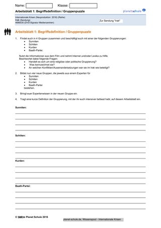 Vor dem Einsatz der Arbeitsblätter stellt die Lehrkraft aktuelle Zahlen geflüchteter Menschen aus dem Irak vor, oder die Schülerinnen und Schüler erhalten die Aufgabe diese Zahlen selbst zu recherchieren. Das Bundesamt für Migration und Flüchtlinge legt regelmäßig aktuelle Zahlen vor, die online einsehbar sind. Aber warum fliehen die Menschen aus dem Irak? Wer flüchtet hier eigentlich vor wem? Die Klasse sammelt die Informationen über den Konflikt und zu unterschiedlichen Akteuren im Klassengespräch. Danach schaut die Klasse gemeinsam den Film. Zunächst sollen die Schüler die Vorgeschichte verstehen und verschiedene relevante Gruppen von Akteuren kennenlernen. Dafür werden die Schüler vorab in vier Gruppen aufgeteilt und bekommen Beobachtungsaufträge. Sie sollen auf die Aktivitäten und Ziele jeweils einer Gruppe von Akteuren achten: Sunniten, Schiiten, Kurden und Baath-Partei. Die Schülerinnen und Schüler machen sich zunächst während des Films Notizen. Anschließend recherchieren sie in Lexika oder dem Internet Informationen zu ihrer Gruppierung, so dass sie eine Kurzbeschreibung verfassen können. Während des Gruppenpuzzles machen sich alle Notizen zu den Beschreibungen der anderen Gruppen.