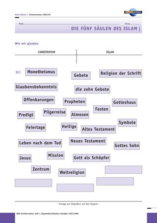 Zum Thema Islam kommt nun die Sendung als Informationsquelle zum Einsatz – erneute Korrektur der Zuordnung. Je nach Zeitplan und gewünschter Vertiefung des Themas können die Schüler/innen auch zum Islam im Internet recherchieren, Texte bearbeiten, Gläubige (Mitschüler/innen) befragen…