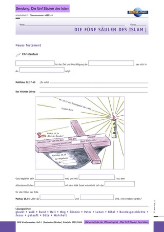 Als zusammenfassender Hefteintrag kann Arbeitsblatt 1a/1b gewählt werden. Arbeitsblatt 2 kann an verschiedenen Stellen zum Einsatz kommen, zum Beispiel direkt im Anschluss an die Sendung oder erst nachdem die Klasse selbst weitere Infos gesammelt hat. Arbeitsblatt 3 ist als Gegenstück zu Arbeitsblatt 2 gedacht; es soll den Schüler/innen (im Vergleich zu den fünf Säulen des Islams) eine Art „Essenz“ der christlichen Überzeugung vor Augen stellen.
