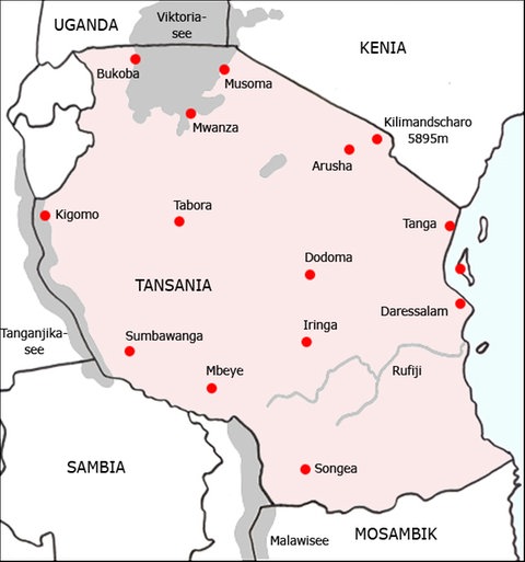 Tansania gehört zu den Staaten des östlichen Afrikas. Der Indische Ozean begrenzt das Land im Osten. Festlandsgrenzen bestehen zu insgesamt acht Nachbarstaaten, beispielsweise zu Kenia im Norden und Mosambik im Süden. Die Hauptstadt ist Dodoma, der Regierungssitz befindet sich in der größten Stadt des Landes Daressalam.
