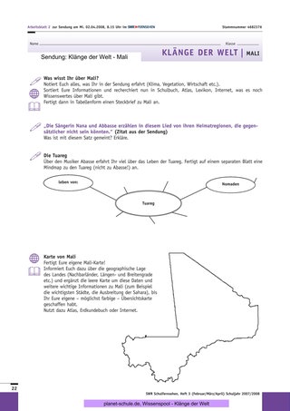 Die Sendung arbeitet mit dem Kontrast zwischen Malis tropischem Süden und dem trockenen Norden. Sie spricht geographische, wirtschaftliche, gesellschaftliche, historische und musikalische Themen an, die im Unterricht vertieft werden können.