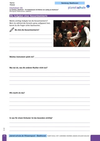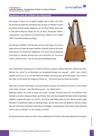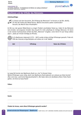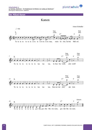 Arbeitsblatt 5 a/b liefert Informationen zum Mälzel-Kanon und zum Ausschnitt im Konzert. Außerdem soll es dazu beitragen, Beethoven besser in den historischen Kontext einzuordnen. (geeignet ab Klasse 5)