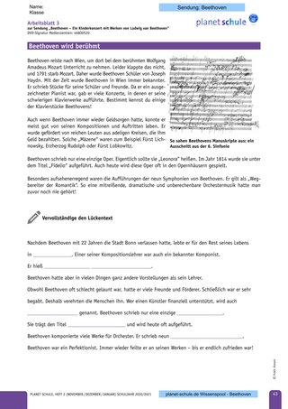 - Arbeitsblatt 3: Beethoven wird berühmt mit Lückentext (als Hörbeispiel: „Für Elise“ am Klavier spielen)