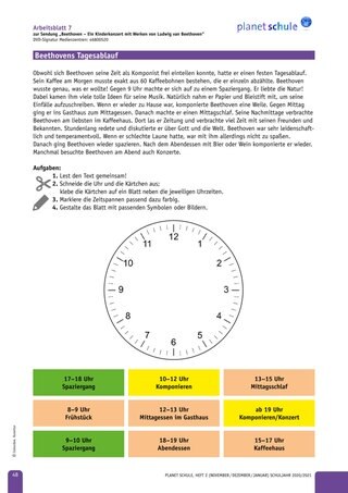 Arbeitsblatt 7: Beethovens Tagesablauf (Zuordnen von Tätigkeiten und Uhrzeiten; Arbeitsblatt eventuell auf A3-Format vergrößern)