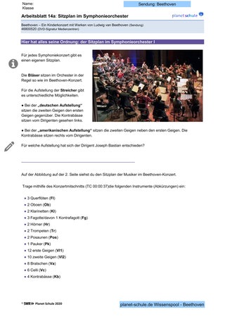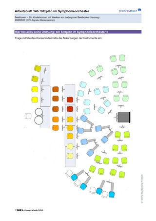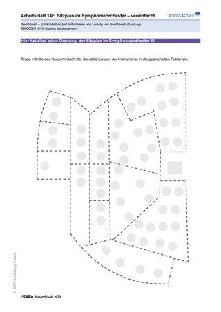 Arbeitsblatt 14 a/b/c: Sitzplan des Sinfonieorchesters während des Konzerts. Die Schüler*innen können mithilfe des Konzertaufzeichnung die einzelnen Instrumentengruppen in den Sitzplan auf Arbeitsblatt 14b eintragen. Der vereinfachte Sitzplan auf Arbeitsblatt 14c zeigt schematisiert die Abgrenzungen zwischen Instrumentengruppen. Er ist für jüngere Schüler*innen geeignet.