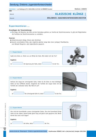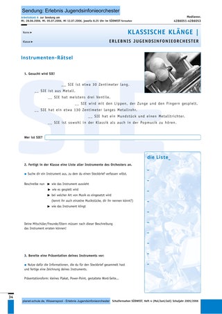 Die Schülerinnen und Schüler erhalten einen Einblick in ein Sinfonieorchester. Sie lernen exemplarisch die Lebenswelt musizierender Jugendlicher und deren Instrumente kennen.