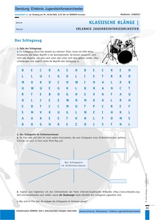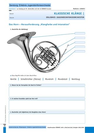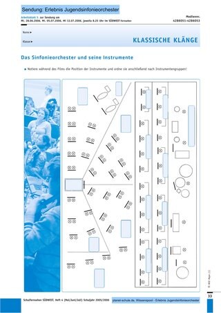 Für die Schülerinnen und Schüler soll im Unterricht neben dem Hören der visuelle Eindruck, das „Konzerterlebnis“, bedeutsam sein – wenn auch nur im Klassenzimmer. Aber aus den Bildern, den Nahaufnahmen der Instrumente oder des gesamten Orchesters in der Totalen wird sicherlich für viele Jugendliche eine neue Perspektive geschaffen, die zuvor wohl eher unbekannt war. Die Faszination des Mitwirkens kann besprochen werden, die Instrumente der drei jugendlichen Protagonisten können unter die Lupe genommen werden. Diese beiden Aspekte sollen hier im Zentrum einer unterrichtlichen Auseinandersetzung stehen. Die vorliegenden Arbeitsblätter (1 bis 6) haben folgenden Schwerpunkt: