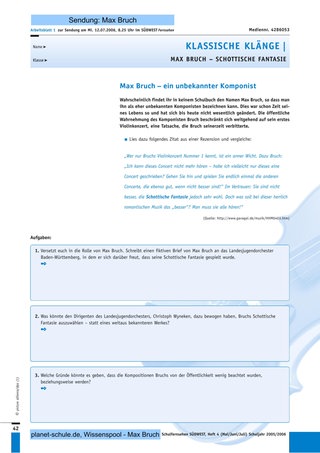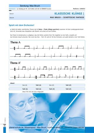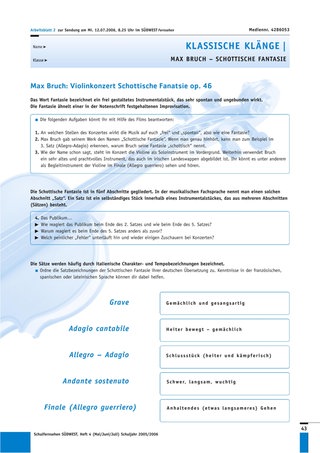 - Arbeitsblatt 2 bezieht sich auf den Konzertmitschnitt des Landesjugendorchesters Baden-Württemberg unter der Leitung von Christoph Wyneken. Der Film bietet gegenüber einer bloßen CD-Aufnahme unter anderem den Vorteil, zumindest in Ansätzen den Charakter einer Konzertatmosphäre wiederzugeben. Das Arbeitsblatt wurde aus der Sicht des Konzertbesuchers (dessen Rolle die Schülerinnen und Schüler ja beim Betrachten des Films einnehmen) gestaltet: Der Besucher erhält ein Programmblatt mit allerlei Fachbegriffen (Name des Werkes, Satzbezeichnungen), die aber für den ungeübten Konzertgänger oftmals eher zur weiteren Verwirrung statt Erhellung beitragen. Ziel ist es, exemplarisch am Beispiel der „Schottischen Fantasie“ die musikalischen Begriffe und Angaben zu klären und die Schülerinnen und Schüler dadurch zu „mündigen“ Konzertbesuchern zu machen. Auch die Rolle des Publikums als Teil eines Konzerts wird thematisiert.
