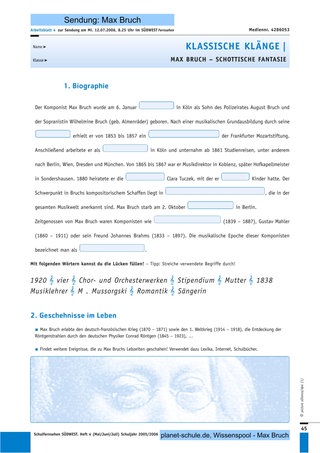 - Arbeitsblatt 4 hat zum Ziel, den Schülerinnen und Schülern einen Abriss über das Leben von Max Bruch zu geben. Im Sinne des vernetzten Lernens sollen sie dabei auch außermusikalische Ereignisse finden, die der Komponist seinerzeit erlebte. Dadurch fällt eine Gesamteinordnung und die Identifikation mit Max Bruch leichter.