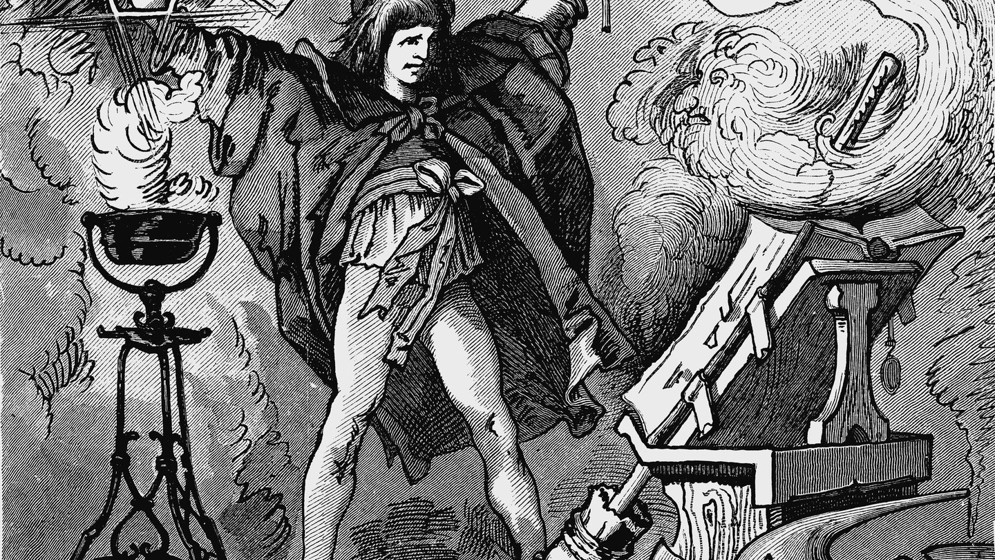 Schwarzweiß-Stich: Der Zauberlehrling in der Mitte des Bilds hebt beide Arme und hat einen Zauberstab in der Hand. Er ist umgeben von Rauch, vor ihm liegt ein großes aufgeschlagenes Buch auf einem Ständer, der Besen lehnt daran.