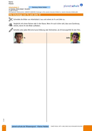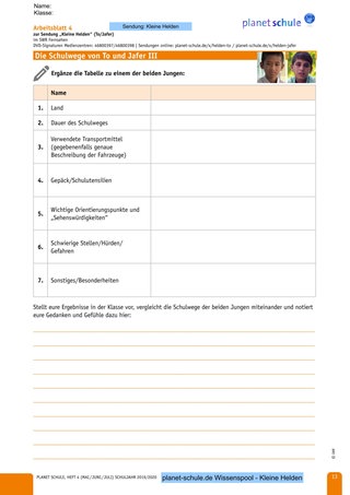 Die Arbeitsblätter dienen dazu, den Inhalt des Filmes noch einmal zu wiederholen und zu festigen; sie eignen sich für eine Kleingruppen- oder Partnerarbeit. Arbeitsblatt 4 kann für eine stärkere Lerngruppe eingesetzt werden oder aber im Anschluss an die Arbeitsblätter 2 und 3 als Vertiefung/Wiederholung, zum Beispiel als Hausaufgabe. Sollen die Schulwege der beiden Jungen vergleichbar gemacht werden, bietet es sich an, die Schüler*innen in Gruppen aufzuteilen. Sie widmen sich beim Ausfüllen der Tabelle auf Arbeitsblatt 4 jeweils einem der beiden Jungen und tauschen sich anschließend entsprechend mit den anderen Gruppen aus, um die Wege zu vergleichen. Ansonsten kann dieses Arbeitsblatt auch zwei Mal kopiert und für beide Jungen ausgefüllt werden.