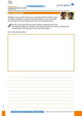 Die Gefahren/Hürden/schwierigen Stellen oder Situationen auf den Schulwegen der beiden Jungen machen sich die Schüler*innen bei der Bearbeitung der Aufgaben von Arbeitsblatt 5 noch einmal mehr bewusst. Hier sollen sie kreativ werden und sich etwas überlegen, was den Schulweg der Jungen erleichtern könnte. Das kann ein (selbst entworfenes) Fahrzeug sein oder ein Hilfsmittel, um beispielsweise das Essen besser transportieren zu können oder ein Gegenstand, der den Weg kurzweiliger macht.
