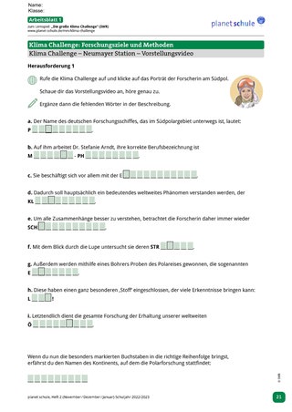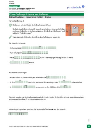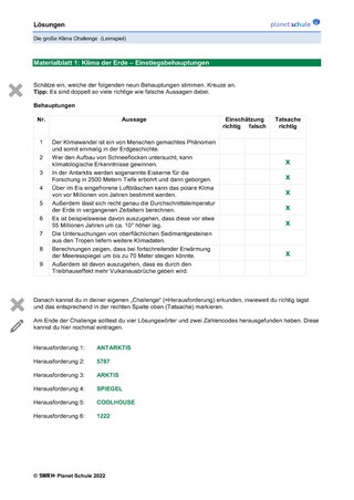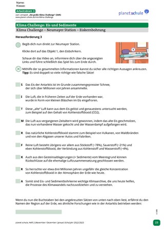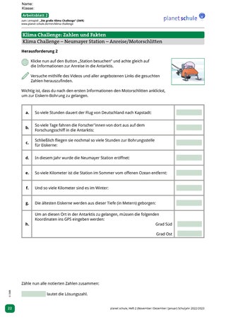 Überleitung zum interaktiven Angebot „Die große Klima Challenge“ des SWR und Aufgabenstellung: Schüler*innen sollen in den folgenden Unterrichtsstunden die Forschungsarbeit zum Klimawandel der Neumayer-Station in der Antarktis mittels der „Klima Challenge“ selbständig erkunden, ihre eigenen „Challenges“ (Herausforderungen) bewältigen, dokumentieren (Arbeitsblätter 1-6) und danach mit ihren Anfangseinschätzungen (siehe Einstiegsblatt) vergleichen.