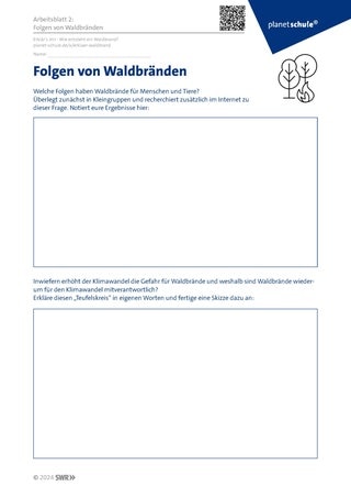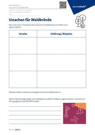 Ansehen des Filmes „Wie entsteht ein Waldbrand?“ und Erarbeitung der verschiedenen Ursachen (Arbeitsblatt 1) und Folgen (Arbeitsblatt 2) für Waldbrände in Einzel- oder Partnerarbeit. Im Plenum werden die Arbeitsergebnisse besprochen.