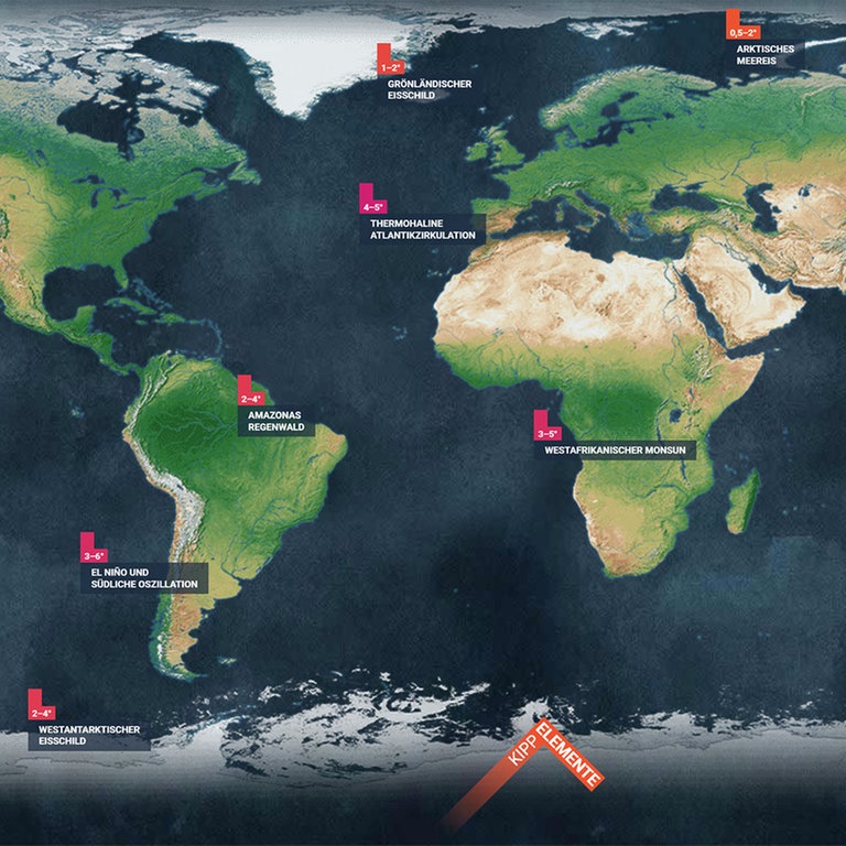 Bestimmte Regionen der Erde werden als mögliche Kipp-Elemente im Klimasystem der Erde angesehen. Wird hier der Kipppunkt erreicht, treten irreversible Prozesse ein oder es verändert sich etwas grundlegend. Einige Prozesse des Klimawandels verstärken sich selbst: Durch die wärmeren Temperaturen schmilzt das Meereis in der Arktis. Ist weniger davon vorhanden, fehlen die weißen, reflektierenden Flächen auf dem Meer und es wird wiederum wärmer. Dies ist ein Kippelement des Klimasystems. Es wird vermutet, dass hier der Kipp-Punkt bereits überschritten, der Prozess unumkehrbar ist. Um das „Umkippen“ solcher Kipp-Elemente zu verhindern, muss man zuerst erkennen, wo die Kipppunkte sind.