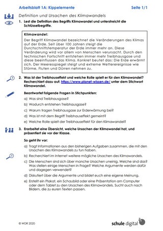 Nun ordnen die Schüler*innen die Schlüsselbegriffe den beiden Schlagwörtern zu. Klären Sie dabei mit Ihren Schüler*innen unbekannte Begriffe. Die Schüler*innen informieren sich nun auf Arbeitsblatt 1 über die Definition des Begriffs "Klimawandel". Dann recherchieren Sie zum Treibhauseffekt. Dabei helfen die Leitfragen auf Arbeitsblatt 1A. Anschließend nutzen sie ihr neues Wissen, um zu prüfen, welche Schlüsselbegriffe sie korrekt zugeordnet haben. Zum Abschluss erarbeiten die Gruppen ein Übersichtsplakat, ein Schaubild oder eine digitale Präsentation mit möglichen Ursachen des Klimawandels. Die Ergebnisse werden exemplarisch im Plenum präsentiert und die anderen Schüler*innen geben Feedback. Den Abschluss bildet eine Diskussion über die Beurteilung der Ursachen. Achten Sie darauf, dass die Schüler*innen den Wert wissenschaftlicher Erkenntnisse erkennen.