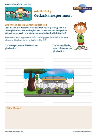 Im anschließenden Gespräch geht es darum, wie sich Selbst- und Fremdwahrnehmung unterscheidet und was jemanden unverwechselbar macht. Was macht Individualität aus? Aussehen, Stimme, Temperament, Gedanken, Gefühle, Hobby, Begabungen, Fähigkeiten,... Ist es bei allen das gleiche? Ein Gedankenexperiment kann sich anschließen: eine Welt, in der alle Menschen gleich wären. Die Kinder sammeln zunächst in Einzel- oder Partnerarbeit auf Arbeitsblatt 5 "Gedankenexperiment" Pro- und Kontra-Argumente, die nachher im Unterrichtsgespräch diskutiert werden.