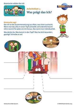 Was prägt die Persönlichkeit? Im Film wird dafür das Bild des Kochtopfs gebraucht, in dem die einzigartige Mischung gebraut wird. Die Schülerinnen und Schüler überlegen mithilfe von Arbeitsblatt 3 "Was prägt das Ich", was sie selbst beeinflusst und geprägt hat. Die Gedanken werden im Unterrichtsgespräch zusammengetragen.