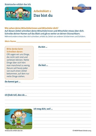 Bevor das erste Arbeitsblatt besprochen wird, füllen sie noch Arbeitsblatt 2 "Das bist du" aus. Jede und jeder schreibt seinen Namen auf das Arbeitsblatt und gibt es an den Sitznachbarn weiter. Dieser schreibt einen netten Satz über die Person und gibt es weiter. Das Arbeitsblatt wird solange weitergegeben, bis es wieder bei dem ursprünglichen Kind landet.
