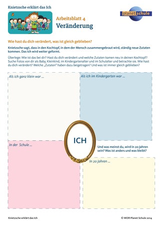 Knietzsche sagt, dass in den Kochtopf ständig neue Zutaten kommen. Wie ist es bei den Schülern? Sie bringen Fotos von verschiedenen Lebensstationen – als Baby, als Kleinkind, im Kindergarten, in der Schule – mit. Zunächst kann die Klasse die Babyfotos betrachten und versuchen, sie zu ordnen. Dann betrachten die Schüler in Partnerarbeit die Fotoreihen und überlegen: Sind sie noch dasselbe Kind wie früher? Was hat sich verändert und wie haben sie sich verändert? Was wird wohl in 20 Jahren noch gleich sein? (Arbeitsblatt 4 "Veränderung") Wenn Sie den Film "Schicksal" schon behandelt haben, können Sie darauf Bezug nehmen. Auf Arbeitsblatt 4 "Lebensweg" aus der Unterrichtseinheit zum Schicksal haben die Schüler prägende Lebensereignisse gesammelt.