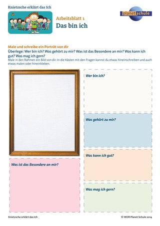 Im Anschluss beschreiben die Kinder sich selbst mit Arbeitsblatt 1 "Das bin ich". Sie malen ein Bild von sich und beantworten in Stichworten die Fragen "Wer bin ich? Was gehört zu mir? Was ist das Besondere an mir? Was kann ich gut und was mag ich?".