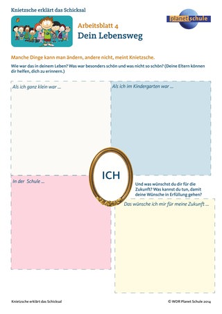Danach hat man die Wahl, was man aus seinem Leben macht, sagt Knietzsche. Stimmt das? Die Schülerinnen und Schüler untersuchen ihren eigenen Lebensweg: Was haben sie erlebt, was wünschen sie sich? Woran konnten und können sie selbst mitwirken und woran nicht? (AB 4 "Lebensweg") Wer möchte, kann seinen Lebensweg in der Klasse vorstellen. In einem Reflexionsgespräch wird besprochen, was den eigenen Lebensweg beeinflusst und was man selbst in der Hand hat.