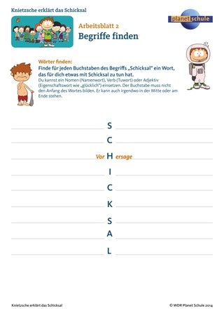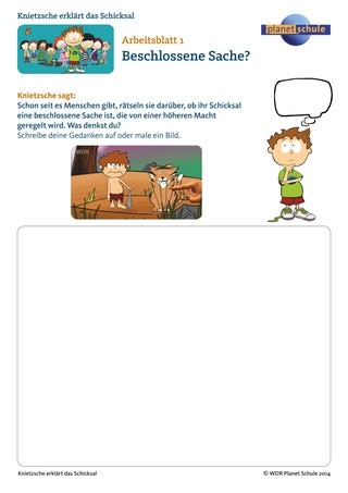 Zu Beginn des Films sagt Knietzsche, dass die Menschheit schon immer darüber gerätselt hat, ob das Schicksal eine beschlossene Sache ist, die von einer höheren Macht bestimmt wird. Was denken die Kinder? Als Impuls kann der Anfang des Films noch einmal gezeigt werden (bis 00:40 Min.). Alternativ können Sie Arbeitsblatt 1 mit dem Zitat nutzen. Die Schülerinnen und Schüler schreiben dazu ihre Gedanken auf oder malen Bilder, die anschließend aufgehängt und besprochen werden (AB 1 "Beschlossene Sache").