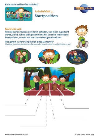 Im Film spricht Knietzsche von der individuellen Startposition, die man nicht beeinflussen kann. Was gehört zur individuellen Startposition eines jeden Menschen? Die Schülerinnen und Schüler überlegen in Einzel- oder Partnerarbeit mithilfe von Arbeitsblatt 3 "Startposition".