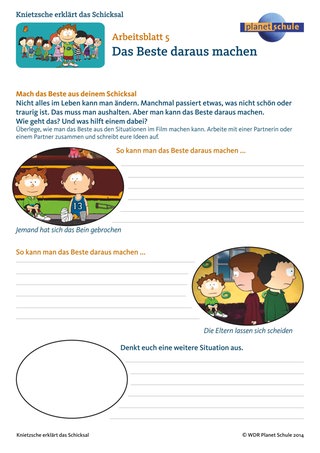 Anschließend entwickeln die Schülerinnen und Schüler in Kleingruppen Ideen, wie man das Beste daraus machen kann, wenn man von kleinen oder größeren Schicksalsschlägen getroffen wird. Ausgangspunkt sind die Beispiele aus dem Film, die Kinder können sich noch andere Schicksalsschläge ausdenken. Wie kann man damit umgehen? Wo findet man Unterstützung?