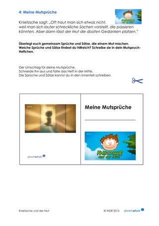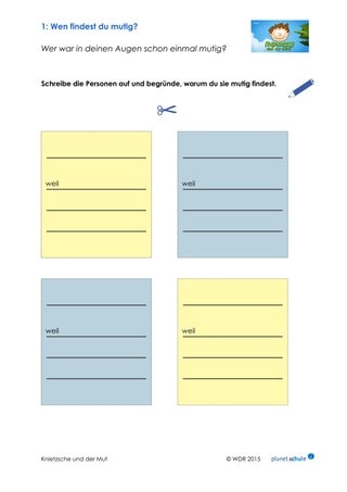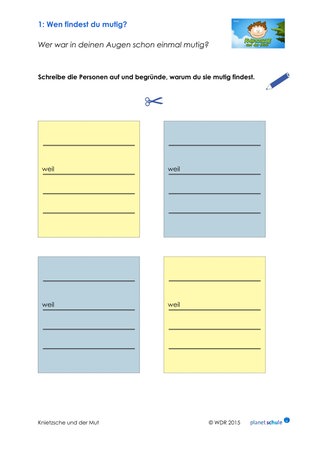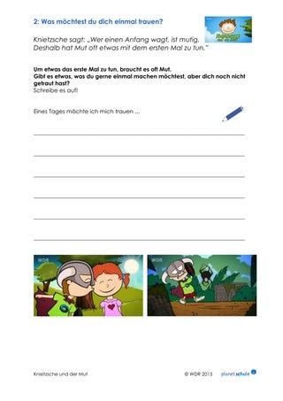Knietzsche sagt: „Wer einen Anfang wagt, ist mutig.” Die Kinder überlegen: Was möchte ich mich trauen? Sie schreiben ihre Antwort auf Arbeitsblatt 2. Vorlesen ist freiwillig. Die Arbeitsblätter können anschließend aufgehängt werden.
