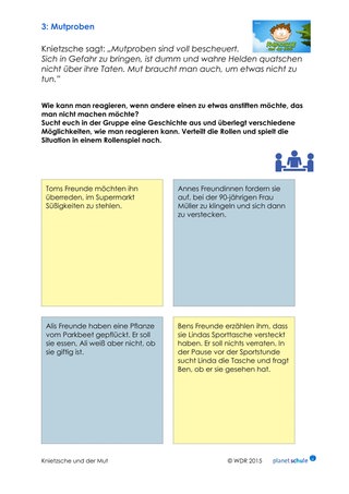 Knietzsche sagt: „Mutproben sind voll bescheuert.” Wie kann man reagieren, wenn einen jemand zu etwas anstiften will? Die Schüler*innen überlegen Reaktionen auf die Situationen auf Arbeitsblatt 3. Dann spielen sie die Situationen in Rollenspielen nach. Anschließend wird gemeinsam über die Rollenspiele diskutiert: Wie habt ihr euch gefühlt? Sind euch manche Möglichkeiten leichter gefallen als andere? Welche Möglichkeit findet ihr mutig?