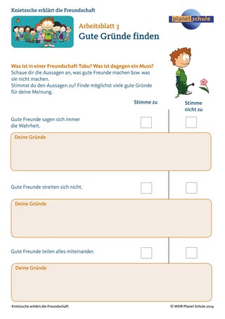 Knietzsche beschreibt im Film vieles, was eine gute Freundschaft ausmacht. Mithilfe von Arbeitsblatt 3 "Gute Gründe finden" beurteilen die Schülerinnen und Schüler verschiedene Aussagen, was Freunde tun oder nicht tun sollten. Sie müssen sich entscheiden und Gründe für ihre Entscheidung finden. Die Kinder füllen das Arbeitsblatt zunächst aus und besprechen die Ergebnisse dann in der Klasse. Im Anschluss finden sie in Partnerarbeit noch weitere Aussagen, was Freunde tun oder nicht tun sollten und begründen sie.
