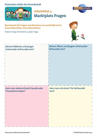Knietzsche sagt im Film: "Freunde sind die Familie, die man sich selbst aussucht." Was ist der Unterschied zwischen Familienmitgliedern und Freunden? Sie können nachmittags auch ihre Eltern fragen, was sie dazu meinen. Verändert sich die Bedeutung von Freundschaft im Leben? Sie können ihre Eltern auch fragen, was ihnen Freunde bedeuten. Sehen sie ihre Freunde genauso oft, wie die Kinder ihre Freunde treffen?