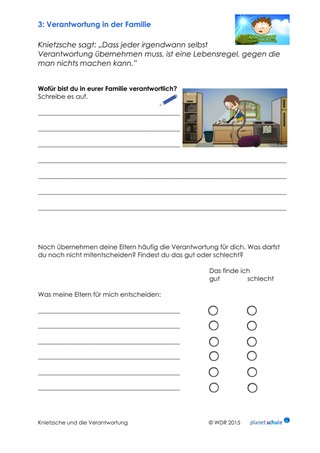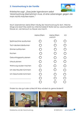 Die Schüler:innen überlegen, wie die Verantwortung in der Familie verteilt ist. Wofür übernehmen sie Verantwortung? Ist die Aufteilung gerecht? Ihre Antworten schreiben sie auf Arbeitsblatt 3 oder sie kreuzen auf Arbeitsblatt 3b die passenden Antworten an.