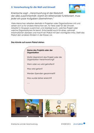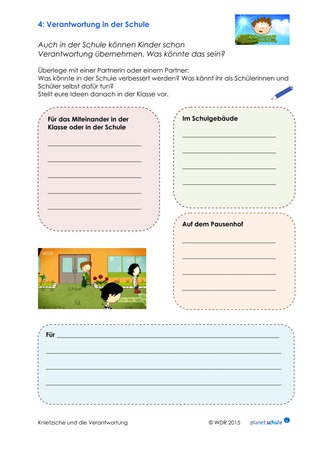 Die Schüler:innen überlegen, wie sie Verantwortung für Verbesserungen in der Schule übernehmen könnten. Ihre Ideen notieren sie auf Arbeitsblatt 4. Als Ergänzung können die Kinder ein Interview mit einem Mitglied des Schülerrats der Schule über dessen Aufgaben und Motivation führen.