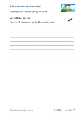 Die Schüler:innen vervollständigen auf Arbeitsblatt 1 den Satz „Wenn ich für etwas verantwortlich bin, bedeutet das ...”