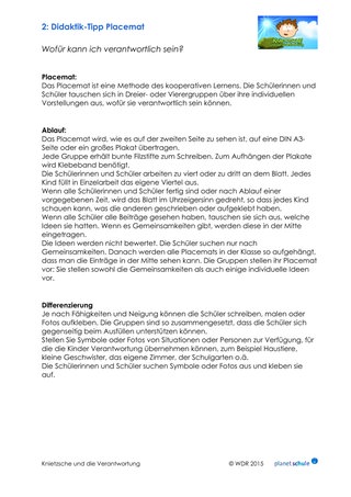 Wofür kann man verantwortlich sein? Die Kinder sammeln in Gruppen Ideen. Dafür kann die Placemat-Methode eingesetzt werden. Sie wird auf Materialblatt 2 erklärt.